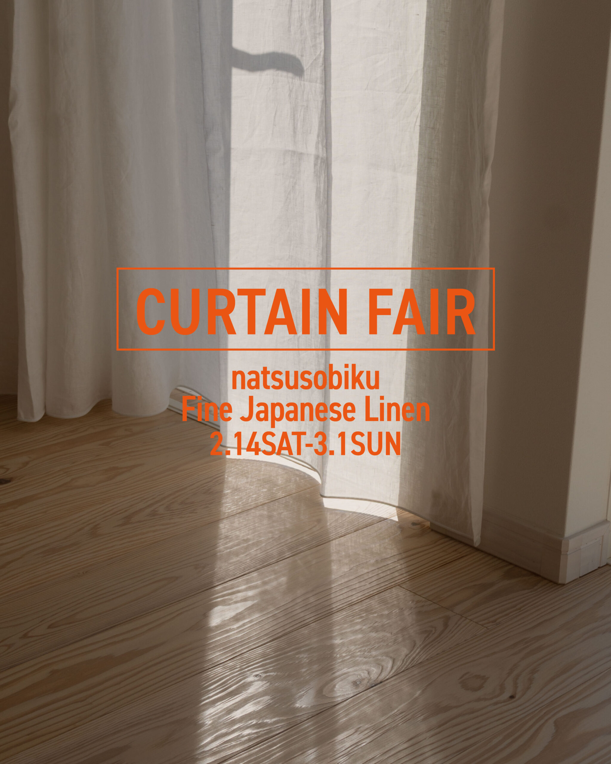 2月14日からはじまるカーテンのオーダーフェア。店頭でご紹介しきれていない、国産リネンカーテンブランドnatusobikuのサンプル生地が60点近く揃います。「natusobikuのカーテンは、光や視線を遮るためのものではなく外にある自然環境と内である室内空間とをゆるやかにつなぐ存在でありたい。」との想いでつくられています。