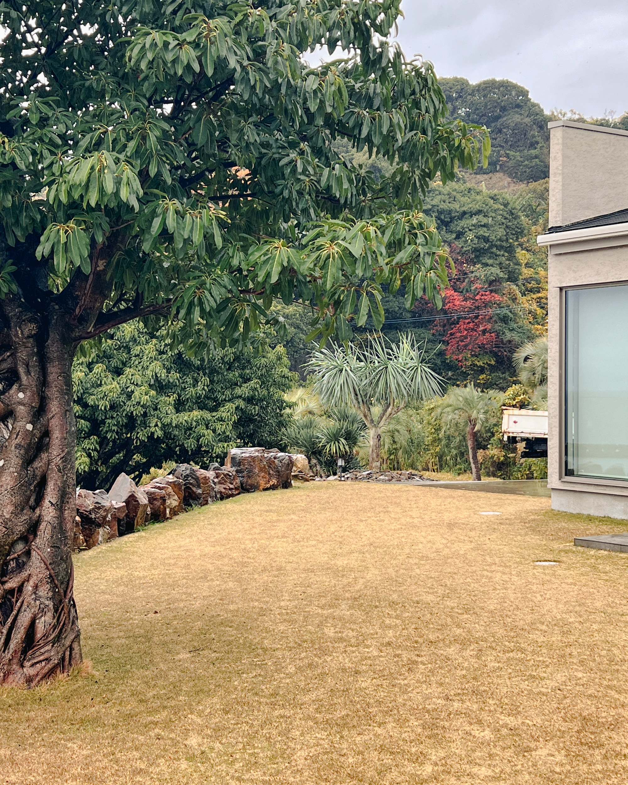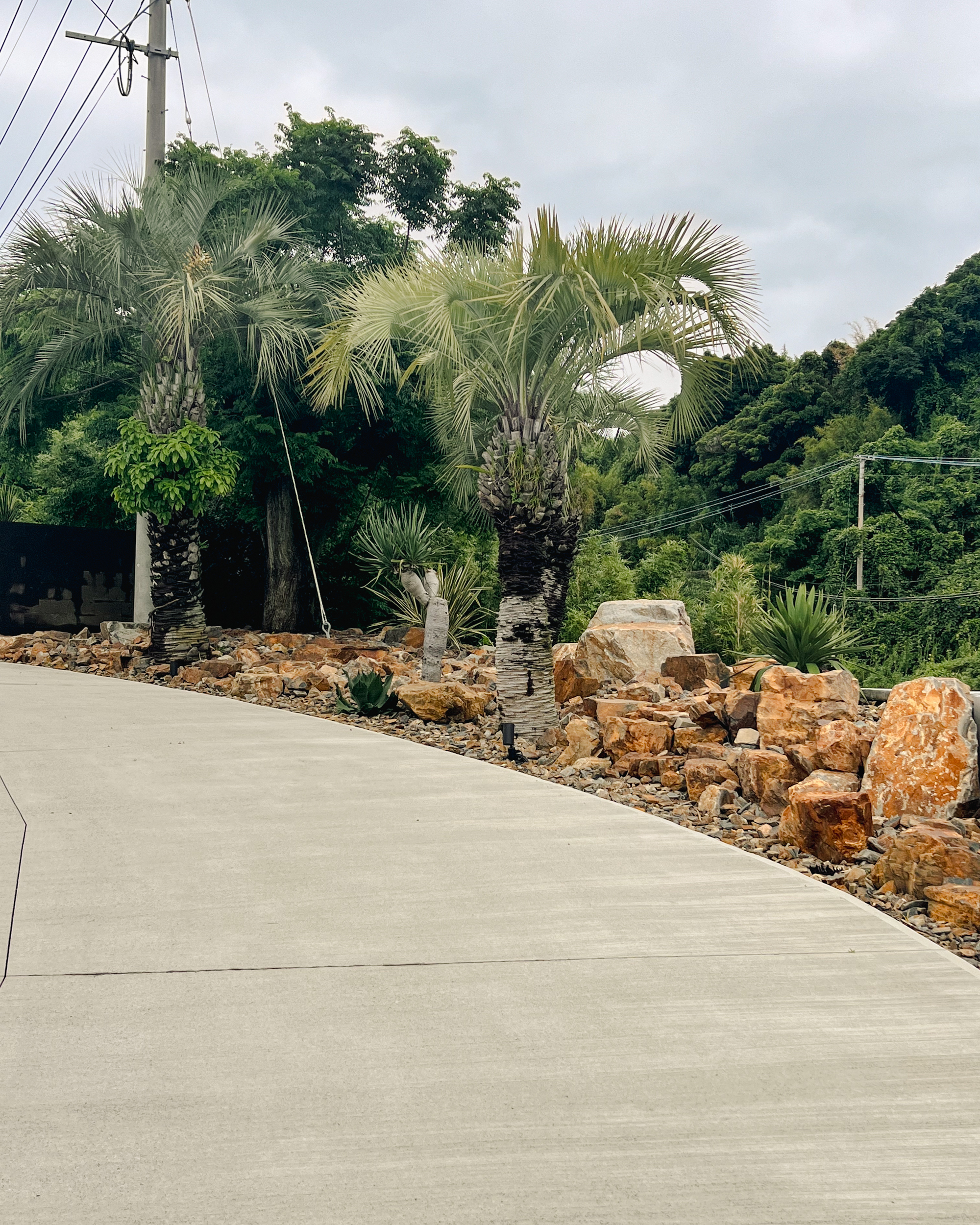 開聞岳を望む海辺に面した個人邸宅の植栽計画。 既存の植栽をベースに、オーナー様と対話を重ねながら、数年をかけて少しずつ樹木を選定・追加しています。 昨年末には、農場で長年養生してきたノリナ、ドラセナ・ドラコ、ナンヨウスギ、マンゴーなど、南国鹿児島の海辺の環境に馴染む樹木を中心に植え込みを行いました。 今春には古木のプルメリアを追加する予定もあり、さらに賑やかな庭へと育っていく計画です。
