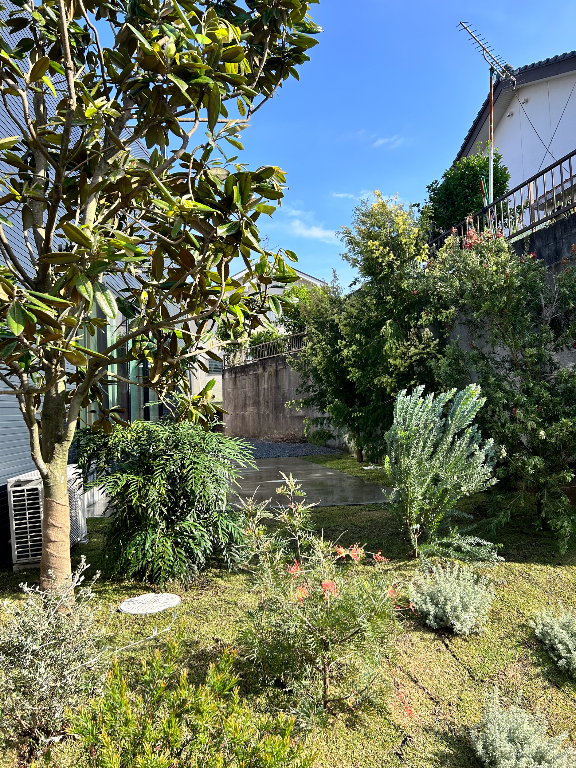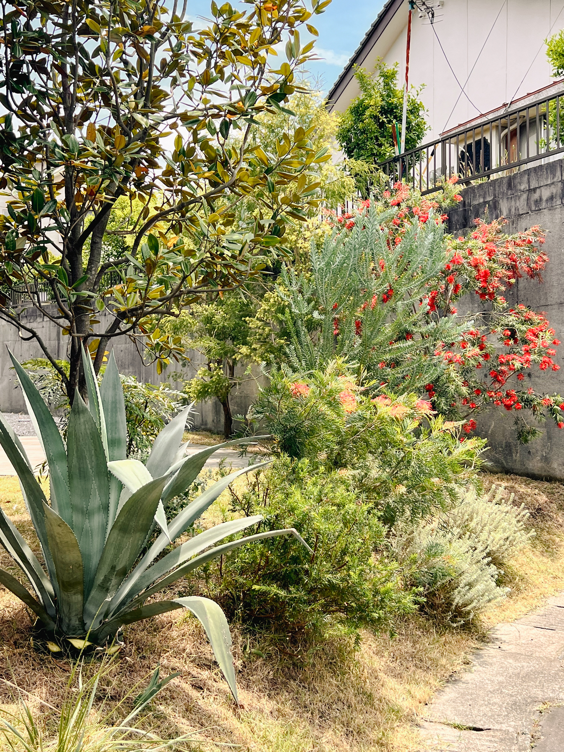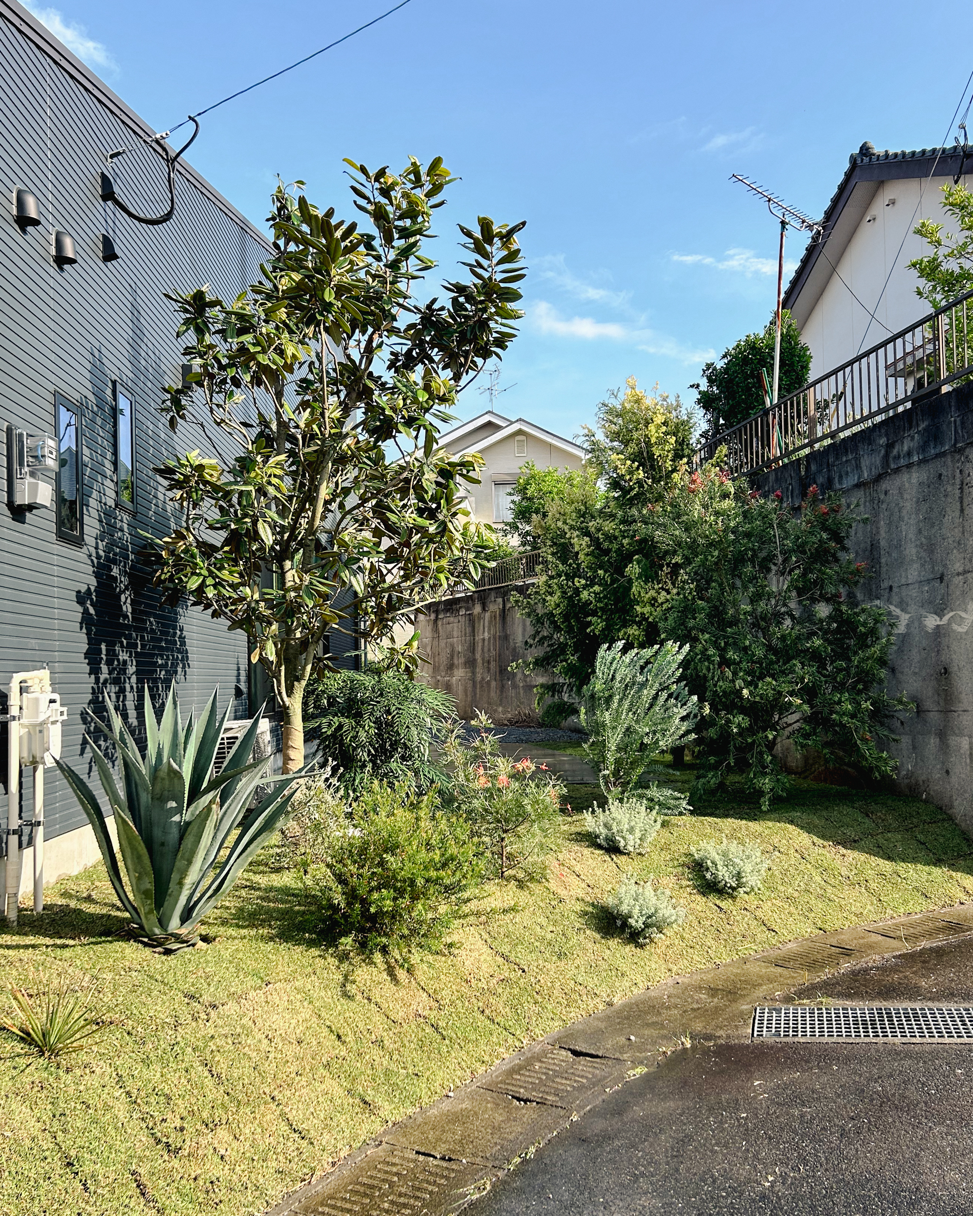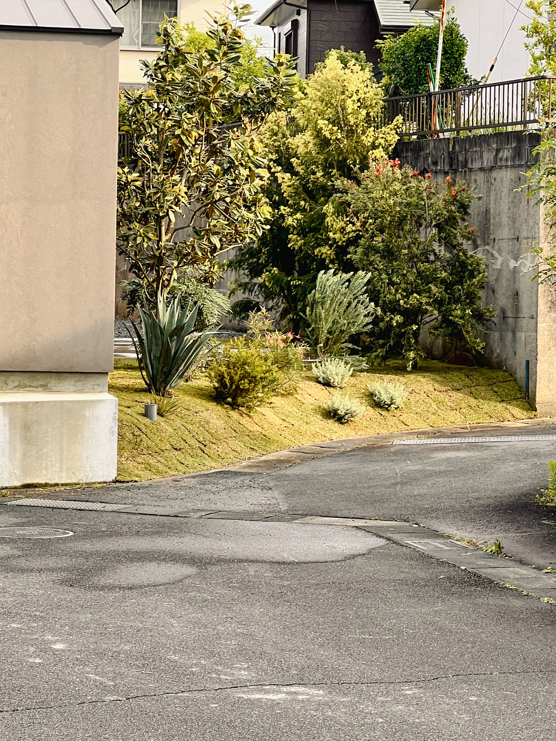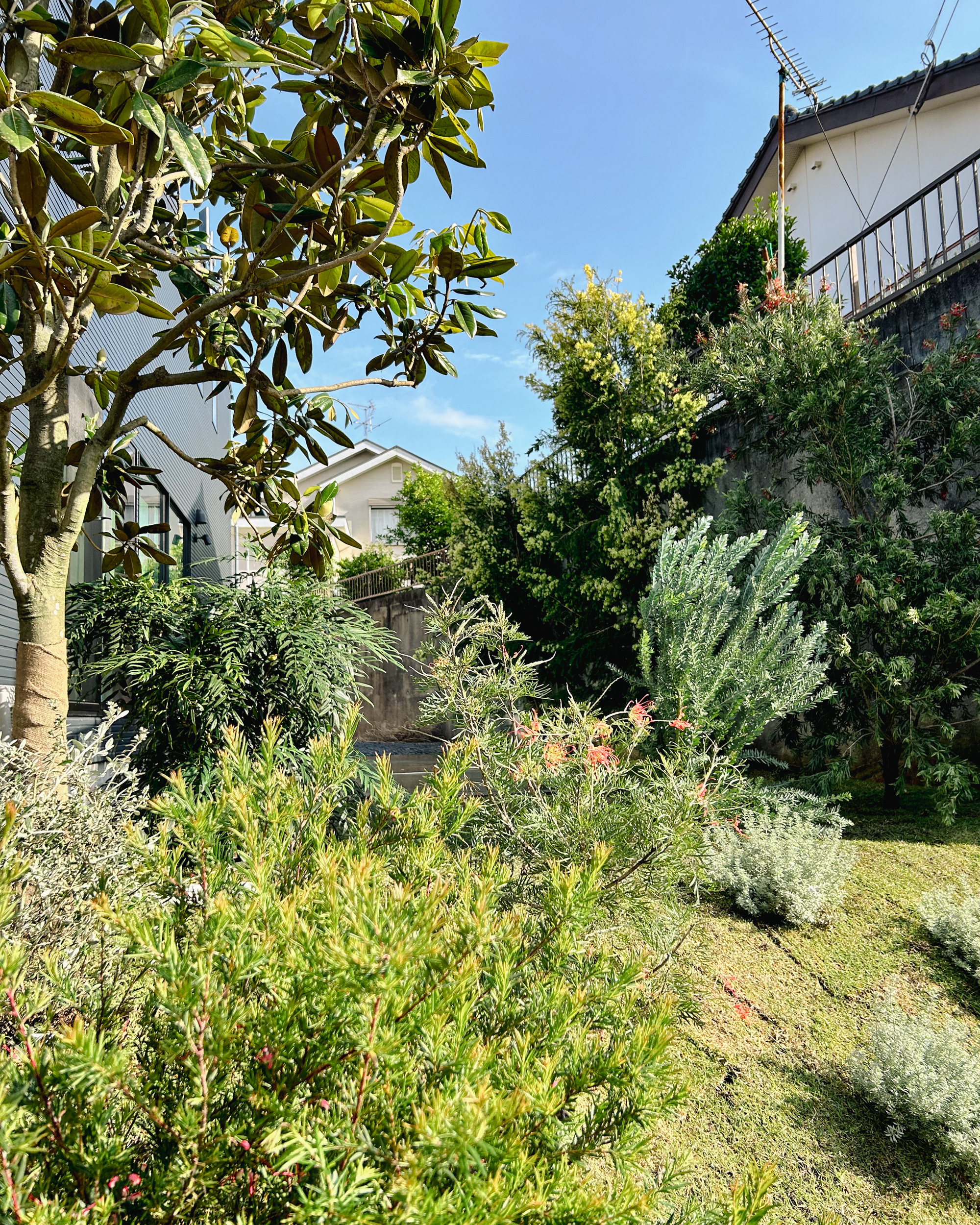 緩やかな坂道にある住宅の植栽。オーナー様のご希望により、ネイティブプランツを中心に、法面のある敷地へ配置しました。季節ごとにさまざまな色や形の花が咲く賑やかな植栽は、植え付けから数年が経ち、ボリュームも増して、より表情のある景色へと育ってきました。通りからの視線をやわらかく遮りながら、周囲の雰囲気にも自然と馴染み、今後の成長が楽しみな庭です。